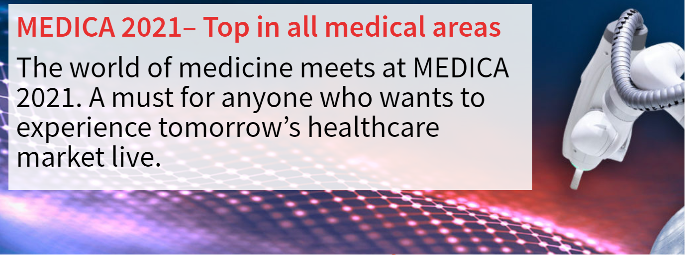 Delve into the world of medical technology! The whole industry will meet at MEDICA in Düsseldorf from 15 – 18 November 2021. Experience high-tech products, meet world market leaders, hidden champions and start-ups or visit the top-class forums and conferences. Regardless what you are looking for: you will find it at MEDICA 2021!