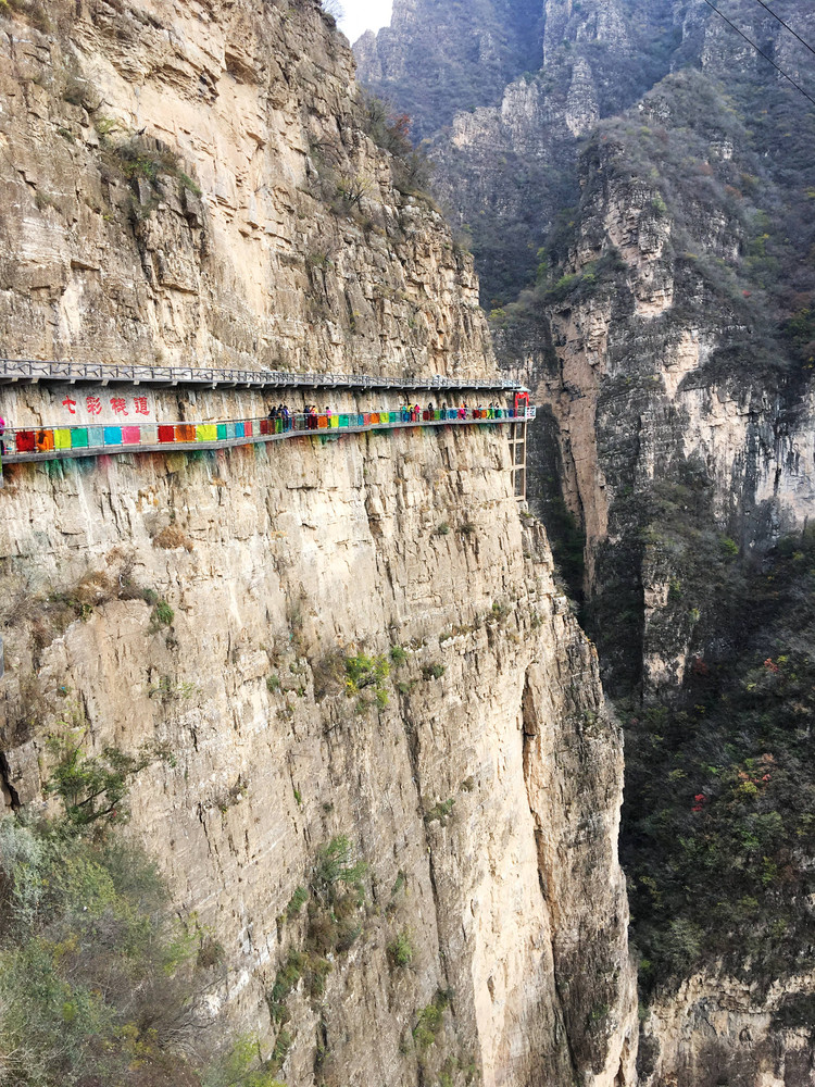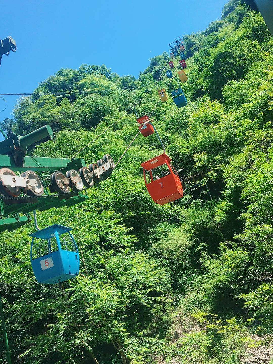 走在狹窄的峽谷中,駐足而望,兩側聳然屹立的翠色絕壁,頭頂上若隱若現(xiàn)的一線天光,遠處山巔的藍天白云,腳下忽左忽右的溪流……若不是那彩色纜車過于美好,“小芯”肯定是要徒步登上山頂?shù)模]錯,“小芯”真的是被纜車“色誘”過去的?。?!